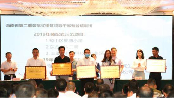 開班儀式上還為省住房和城鄉(xiāng)建設(shè)廳組織評審出的2019年裝配式建筑3個示范項目“瓊山區(qū)椰博小學(xué)”“三亞崖州灣科技城產(chǎn)業(yè)促進中心”“東方之珠二期” 和2個示范基地“海南創(chuàng)藍易筑裝配式建筑技術(shù)有限公司生產(chǎn)基地”“途會裝配式建筑產(chǎn)業(yè)園(海南)有限公司基地”進行了授牌。